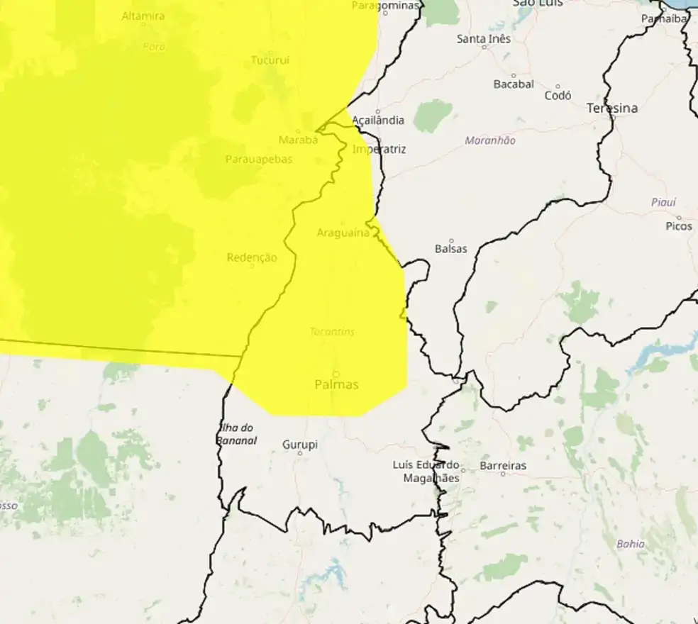 O Instituto Nacional de Meteorologia (Inmet) emitiu um alerta amarelo de chuvas intensas para grande parte do Tocantins, incluindo as regiões central, norte e Bico do Papagaio. O aviso começou nesta última quarta-feira (8) e termina na quinta-feira (9), às 9h. A previsão é de chuvas com 20 a 30 milímetros por hora.