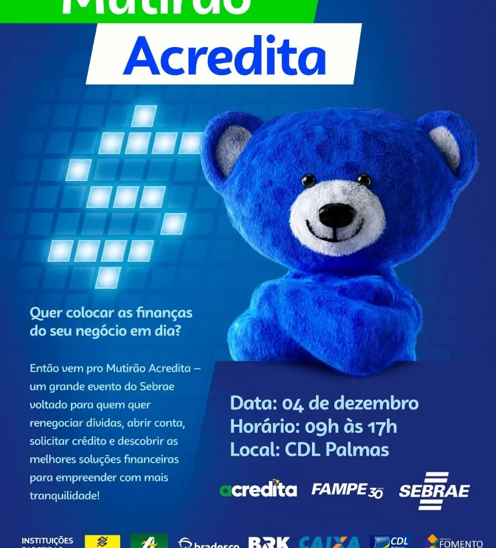 O Sebrae Tocantins realizará, no dia 4 de dezembro, o Mutirão Acredita, uma mobilização gratuita voltada para empreendedores que desejam organizar as finanças de seus negócios e acessar novas oportunidades de crédito. O evento acontece na CDL Palmas, das 9h às 17h, e contará com a participação de instituições financeiras, especialistas em educação financeira e consultores do Sebrae.